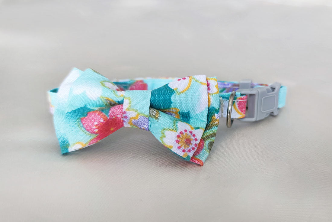 Coleira elegante com laço removível, para gato ou cão de porte mini. Com padrão floral e fecho plástico normal, é elegante e perfeita colocar a medalha de identificação.