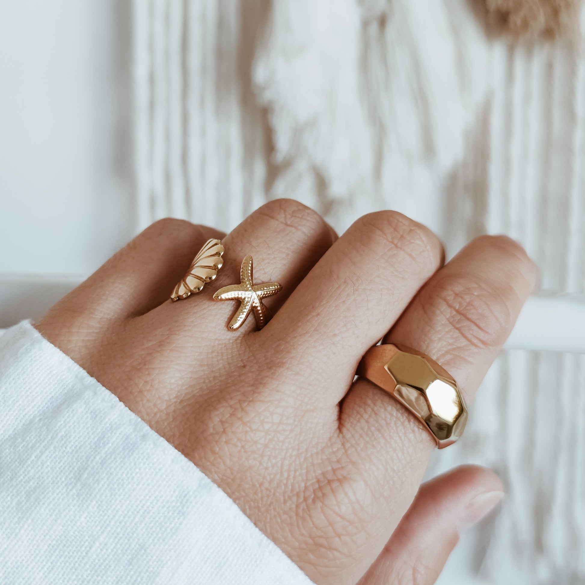 Anel de aço inoxidável com banho de ouro. O design aberto na frente, com uma concha e uma estrela-do-mar confere-lhe um toque refrescante, descontraído e perfeito para os dias quentes de verão.