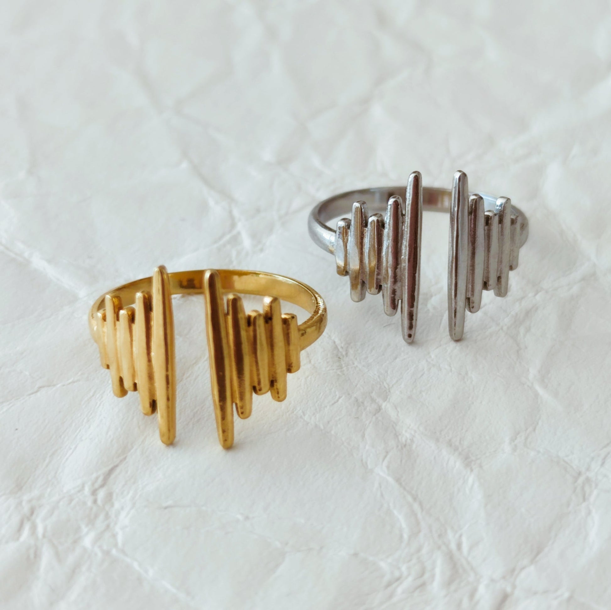 Anel de aço inoxidável com banho de ouro. O seu design contemporâneo e natural confere-lhe um charme que combina com personalidades criativas e elegantes.