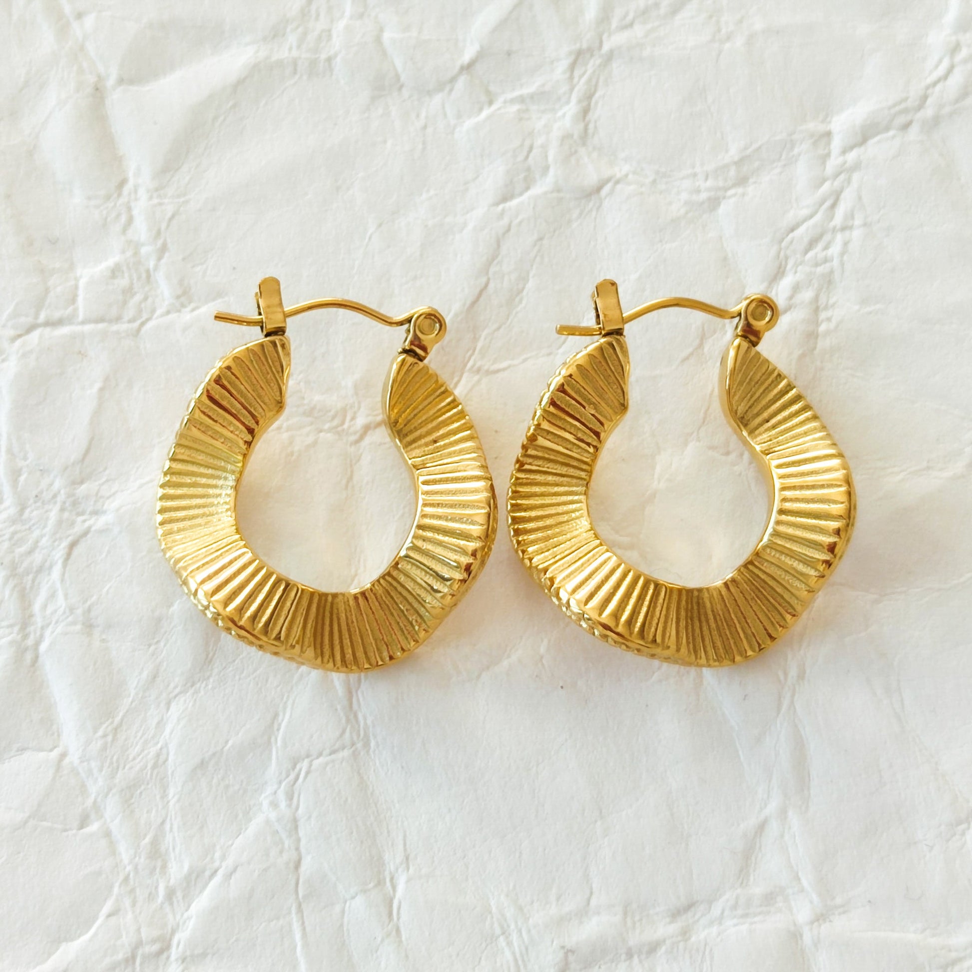 Brincos em forma de argola torcida, de aço inoxidável, banhado a ouro. Sofisticados, elegantes e intemporais. Vendidos ao par.