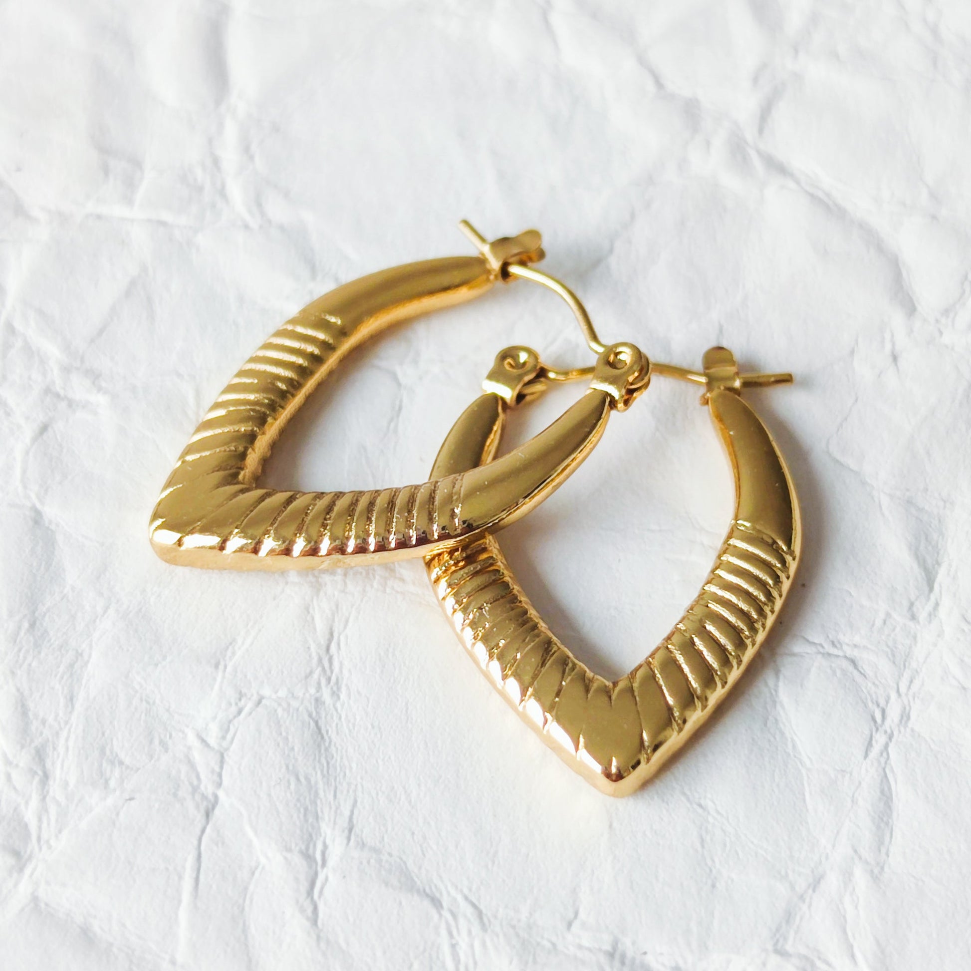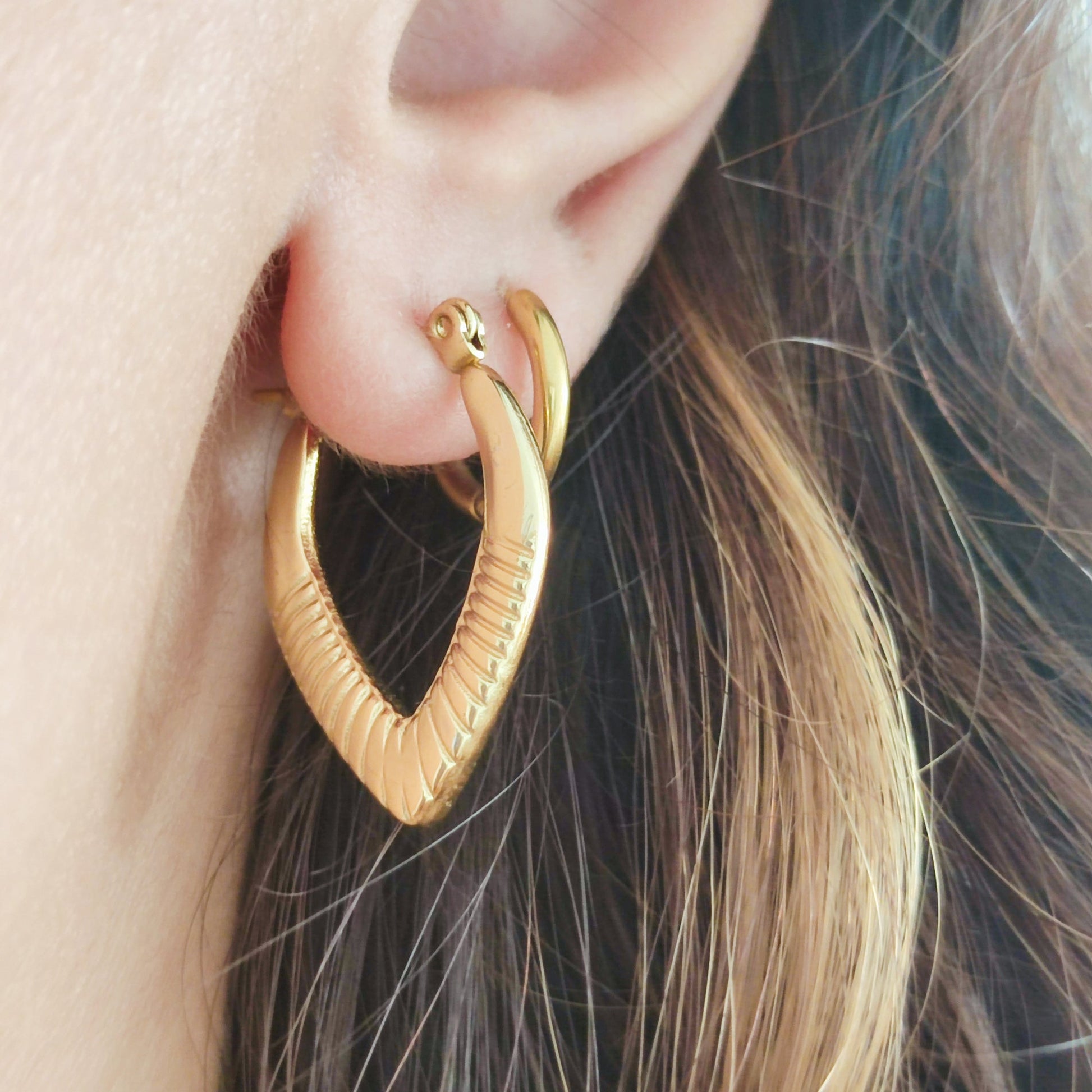 Brincos em forma de argola comprida trabalhada, de aço inoxidável, banhado a ouro. Elegantes e intemporais. Têm o encaixe da orelha muito fino, ficando confortáveis em todos os futos. Vendidos ao par.