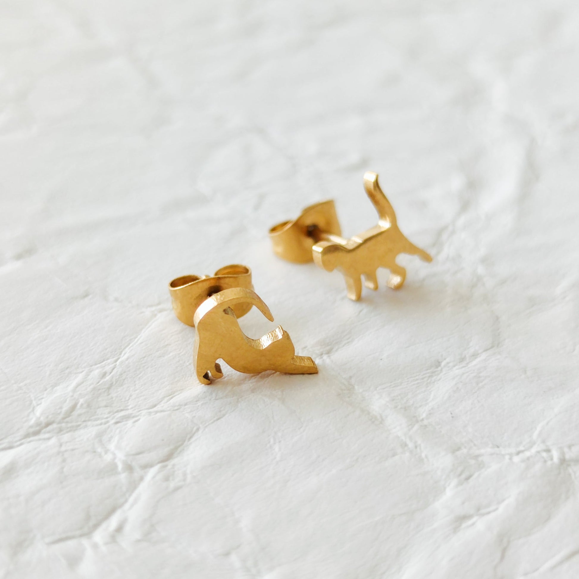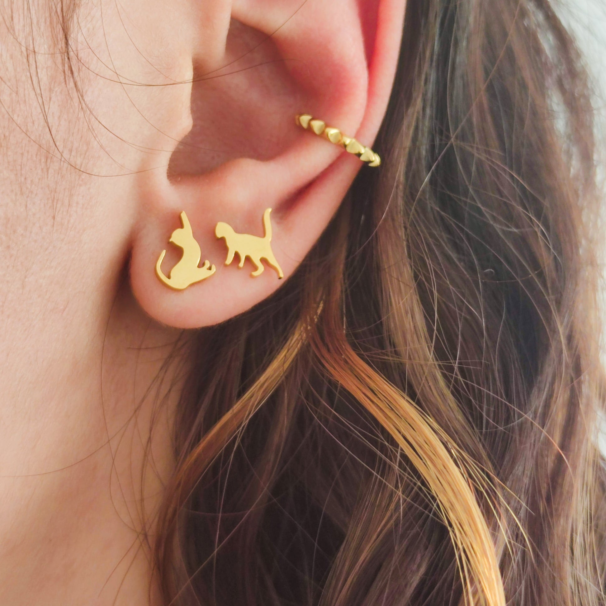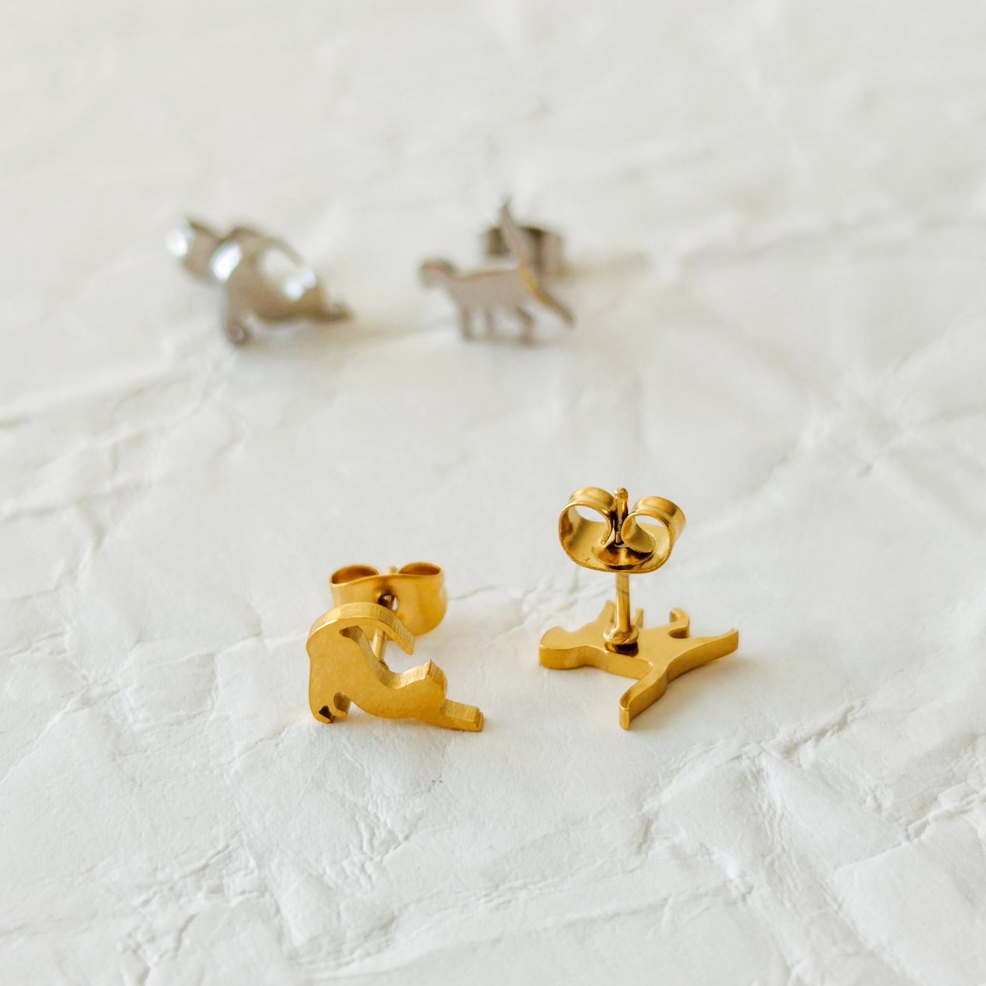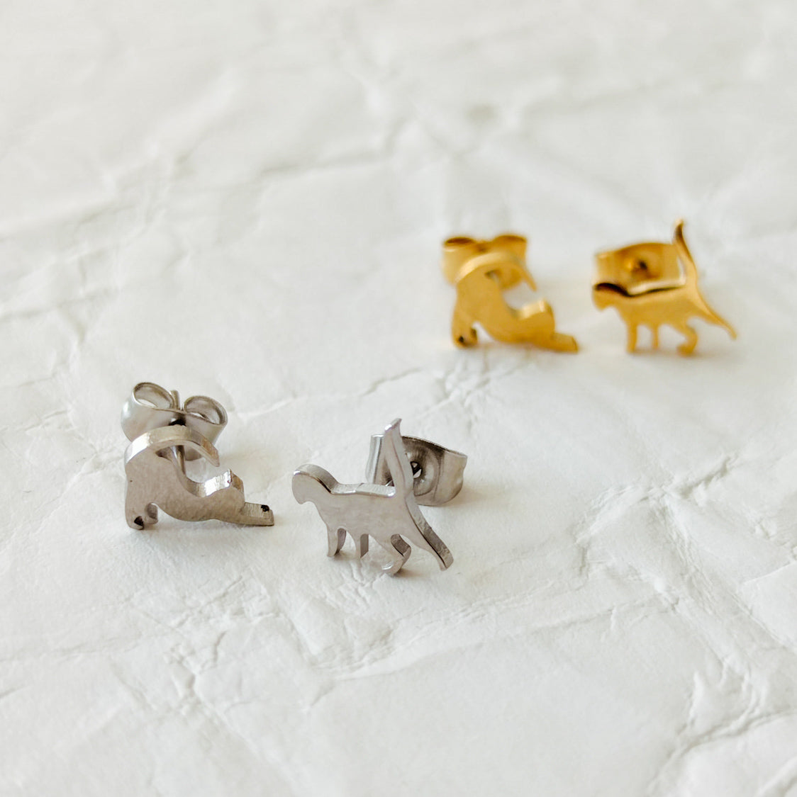 Brincos tipo studs de aço inoxidável, disponíveis em prateado ou banhados a ouro. Cada brinco é distinto do outro, apresentando um gato em diferentes posições. Estes brincos adicionam um toque divertido e encantador ao teu visual, enquanto celebram a personalidade felina de uma forma elegante e discreta.