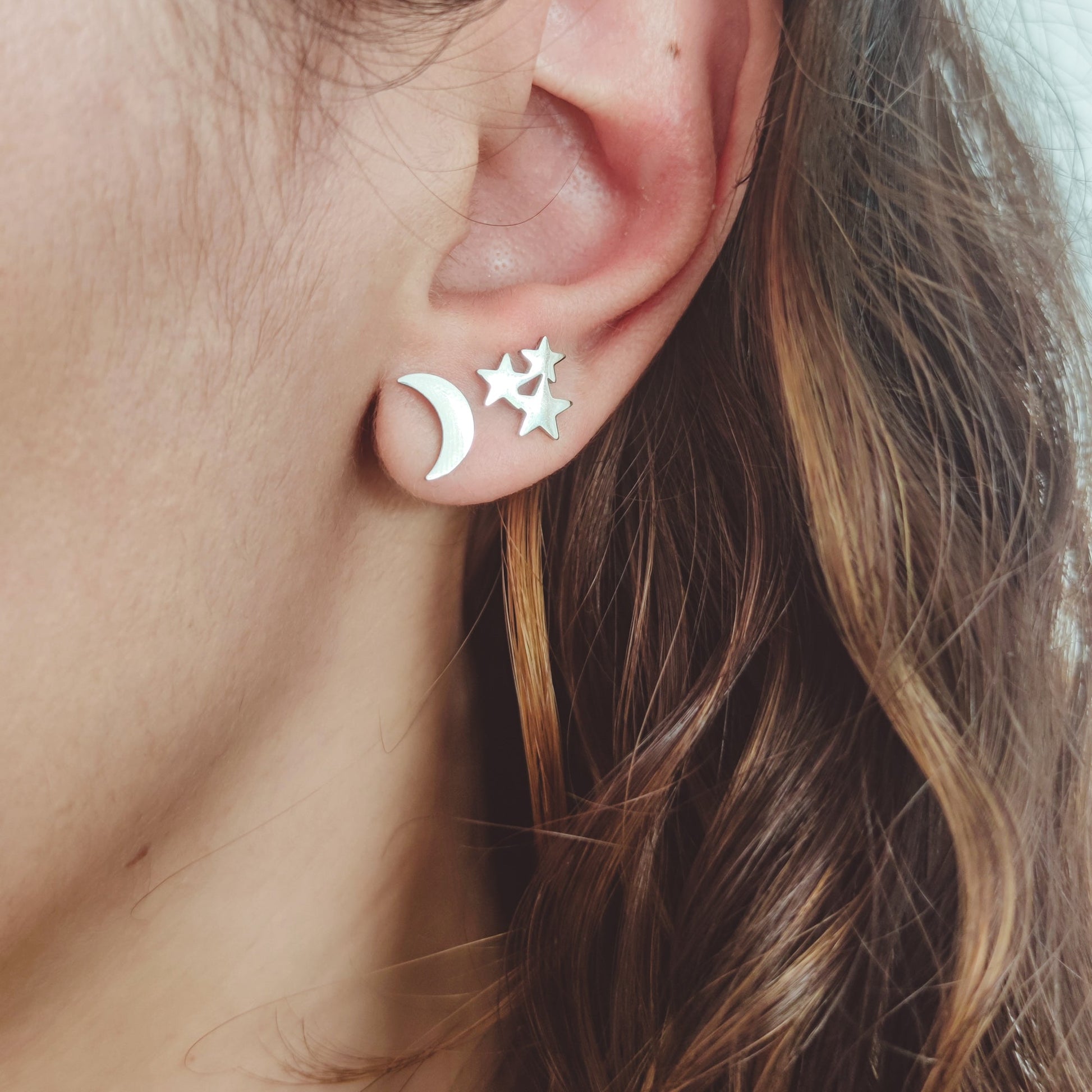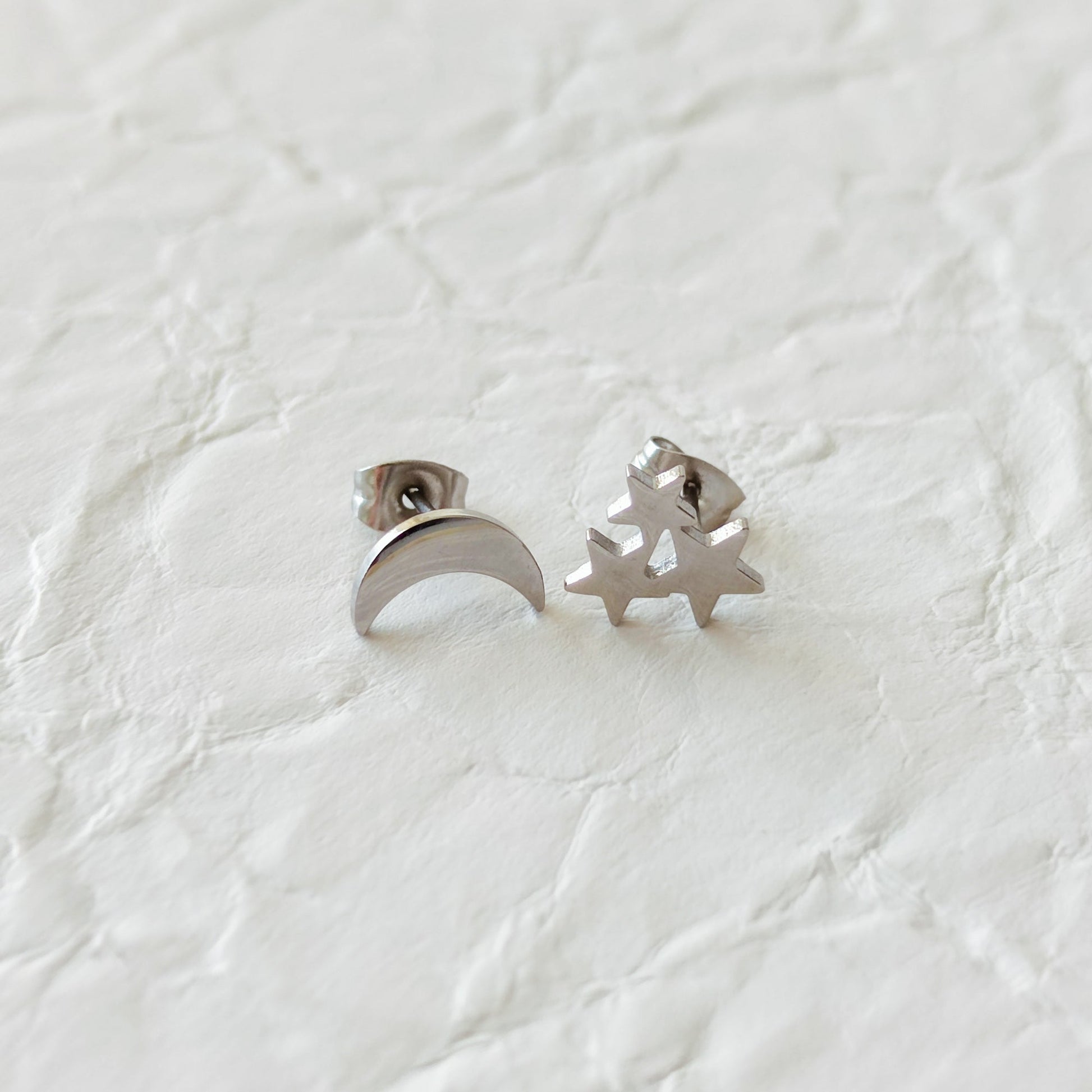Brincos pequenos de aço inoxidável, prateados e distintos um do outro. Um apresenta o design de uma lua, enquanto o outro exibe três estrelas. Versáteis, irreverentes e elegantes, esses brincos adicionam um toque de misticismo boho ao teu visual. Expressa a tua individualidade e estilo de forma única e encantadora. Vendidos ao par.