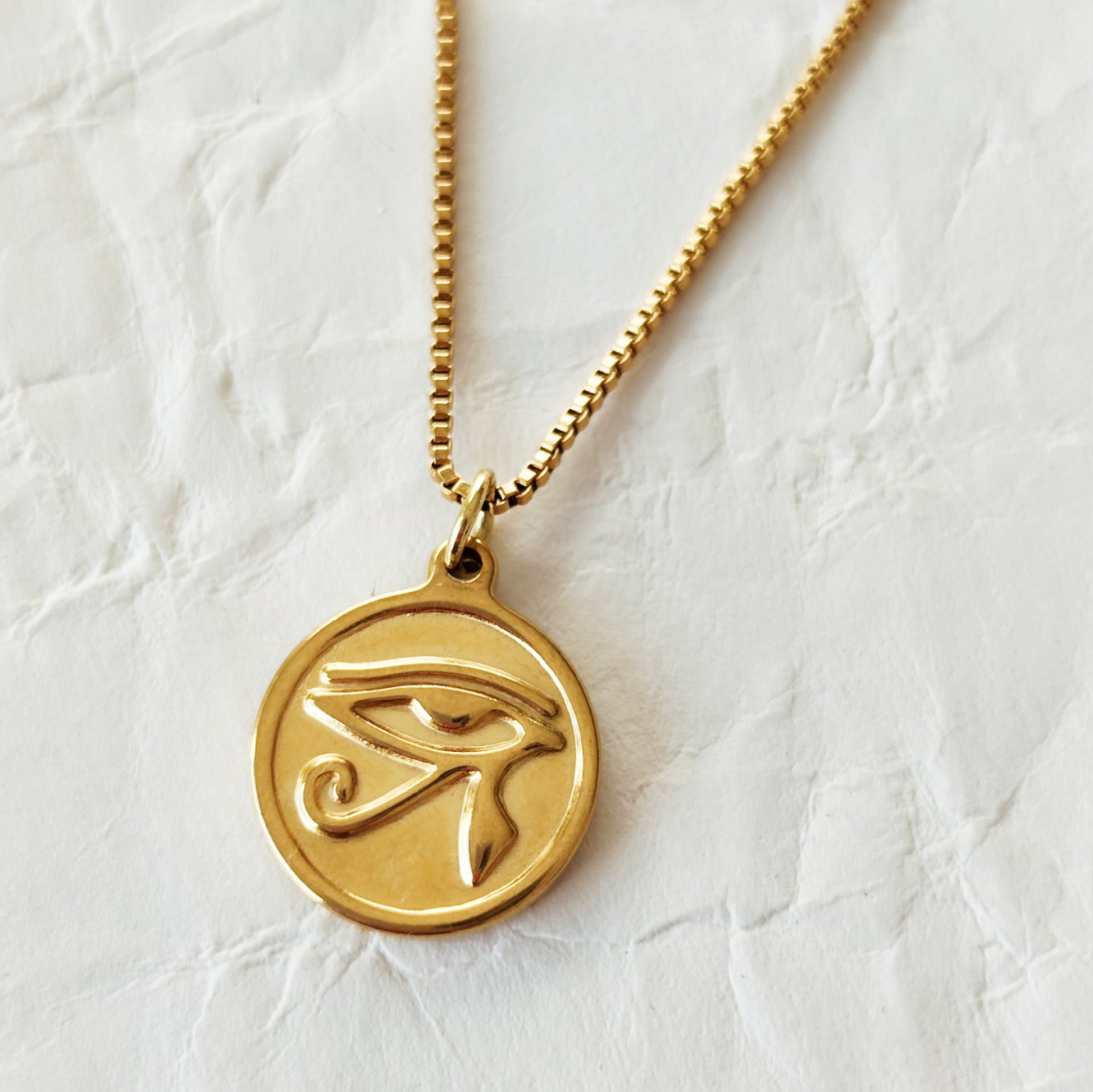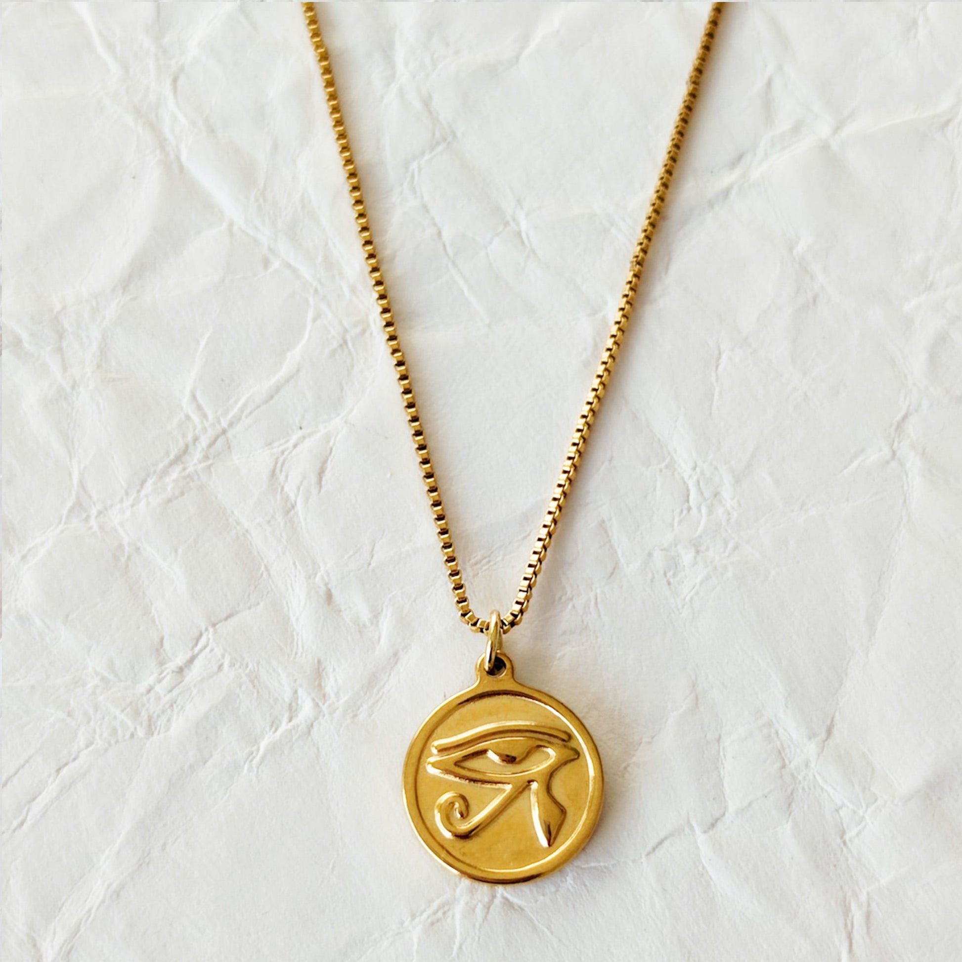 Colar de aço inoxidável, de corrente veneziana, banhado a ouro, com pendente redondo com o olho de Hórus. O Olho de Hórus, ou Udyat é um símbolo oriundo do Antigo Egito. Dentre seus muitos significados e usos, os mais comuns e genéricos são os de poder e proteção. É um dos amuletos mais populares e poderosos de todos os tempos.