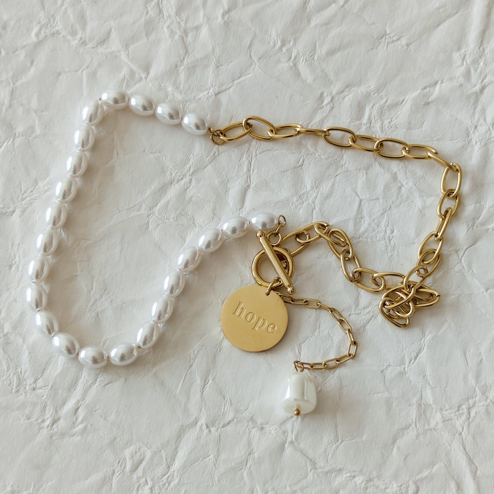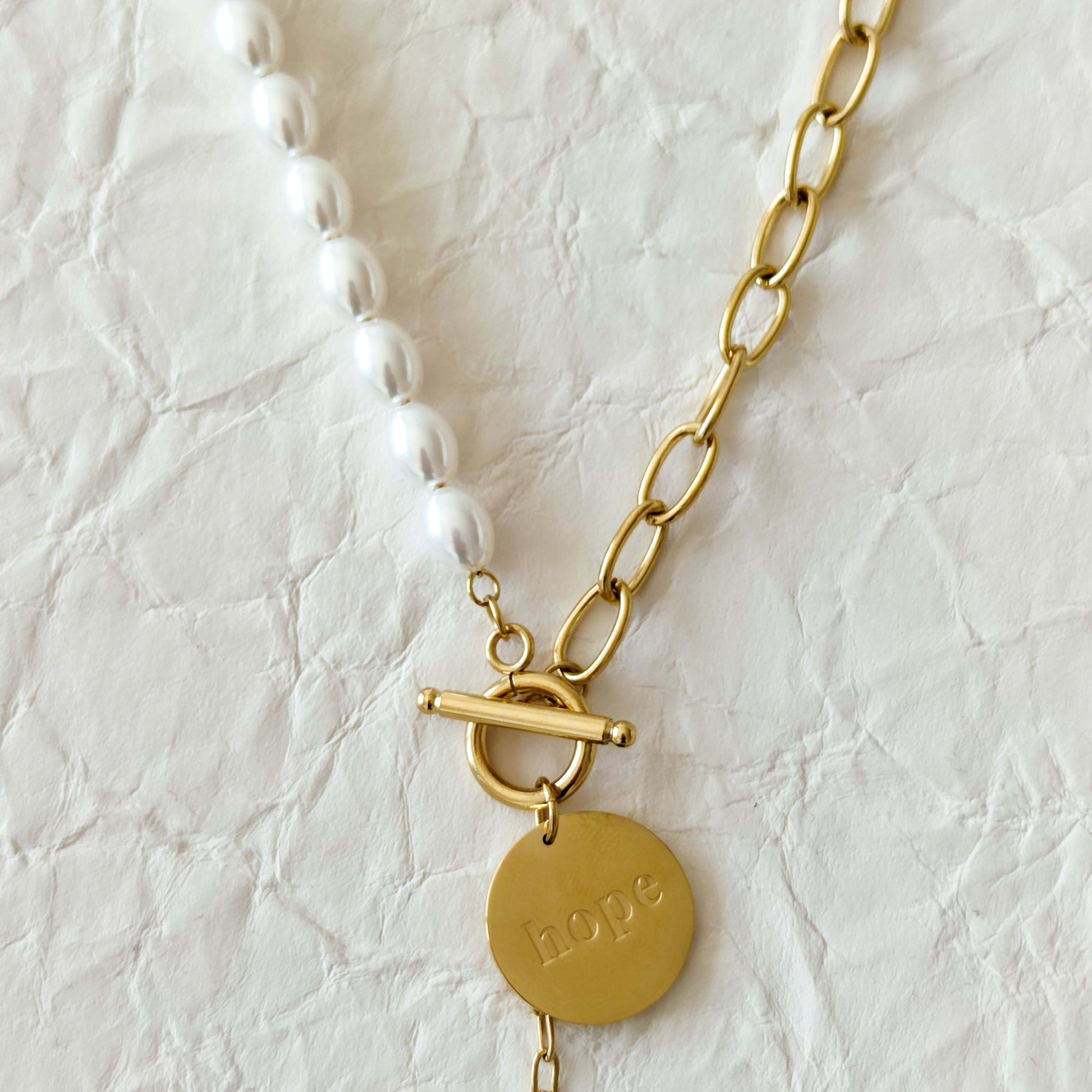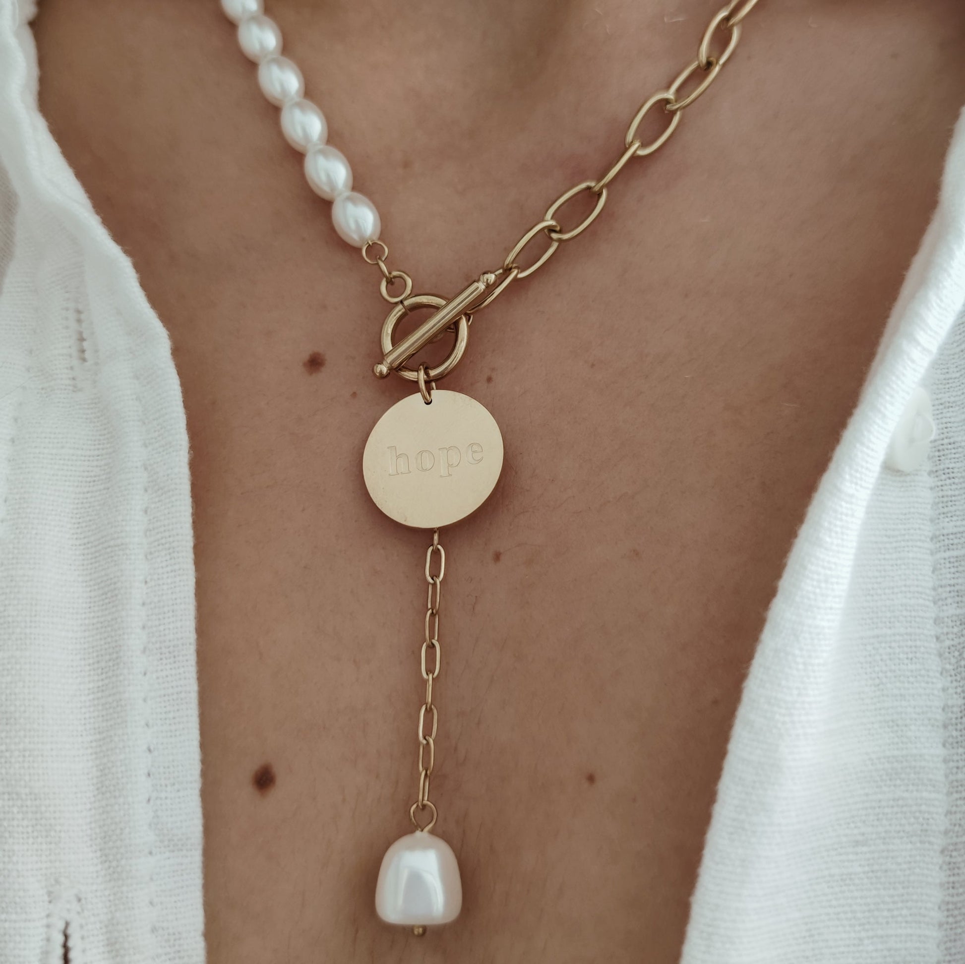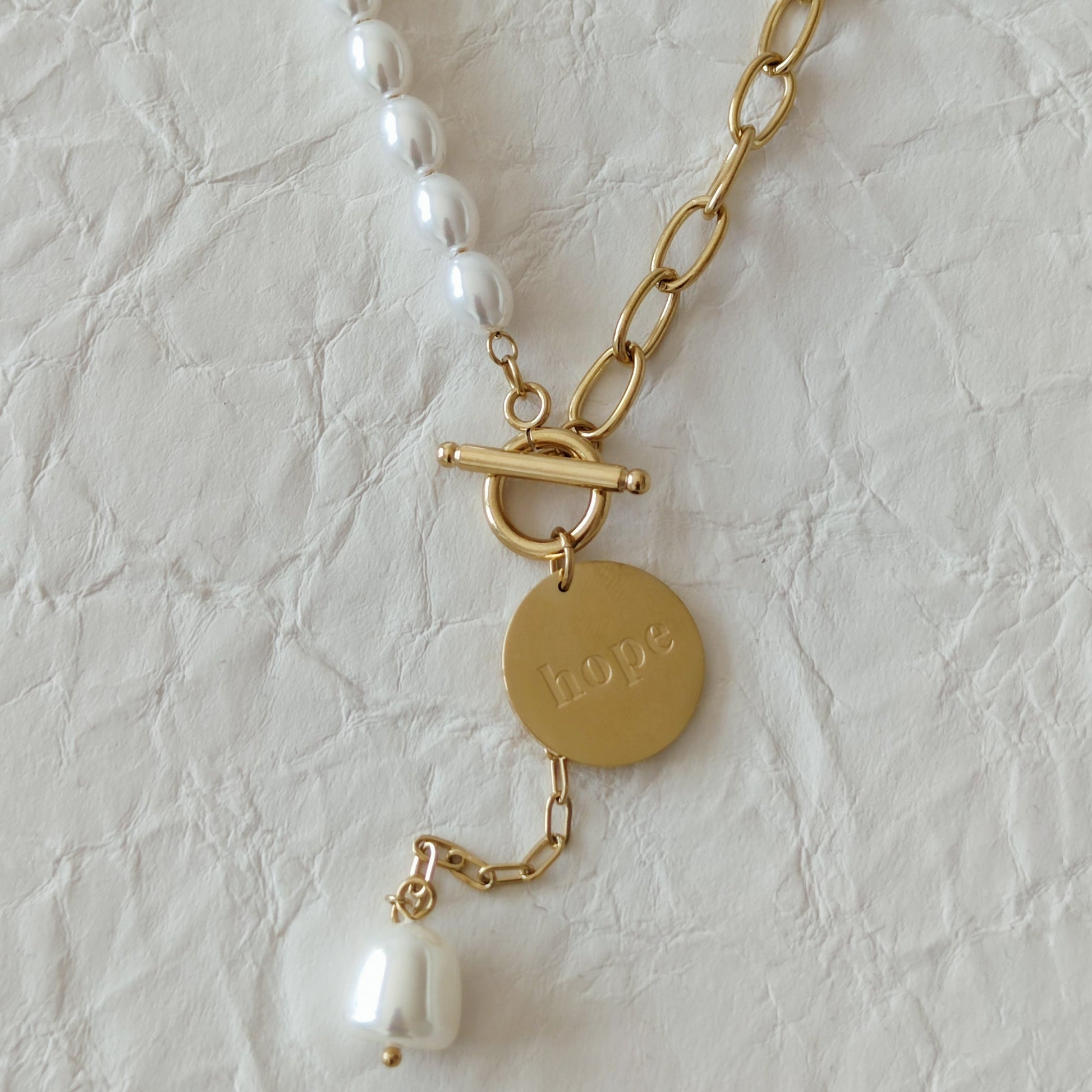 Colar de aço inoxidável banhado a ouro, diferente dos dois lados, com corrente e fiada de pérolas artificiais leves, com fecho T, medalha com hravação "hope" (esperança) e pendente com pérola. Elegante e original, intemporal e arrojado.
