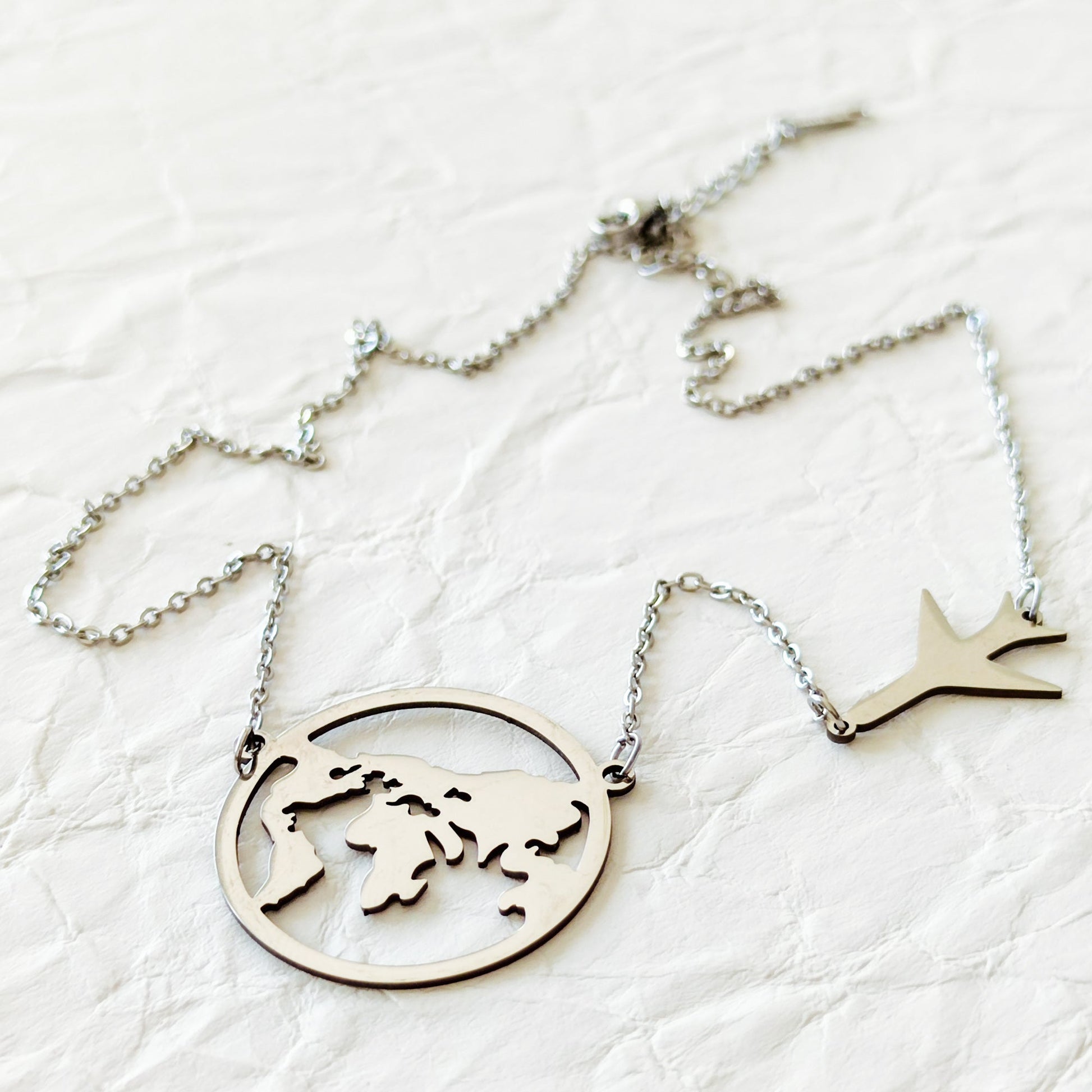 Colar de aço inoxidável prateado. Design de globo terrestre centrado com um avião ao lado. Este colar é especialmente apreciado por amantes de viagens e cidadãos do mundo, captando o espírito de aventura e os descobrimentos. É maior do que os colares equivalentes encontrados no mercado, garantindo-se como uma peça central em qualquer visual. Adiciona um toque de  paixão pela descoberta ao teu estilo com este colar marcante.