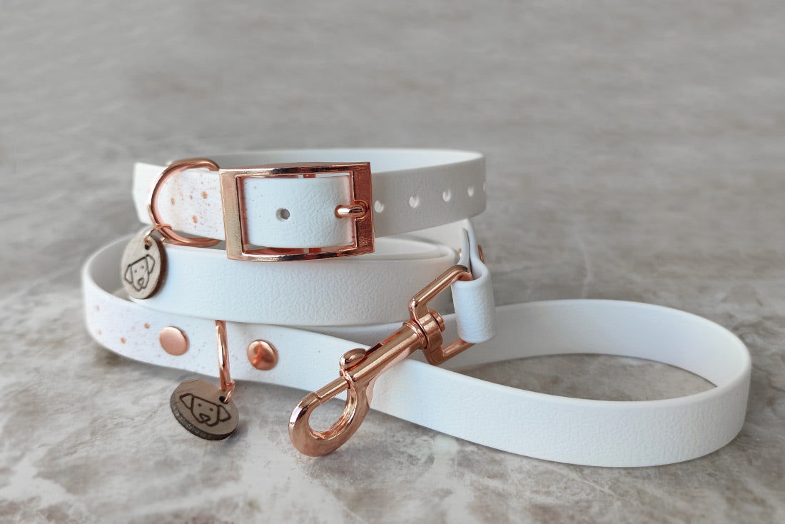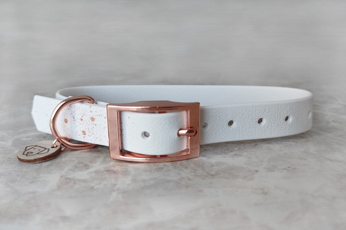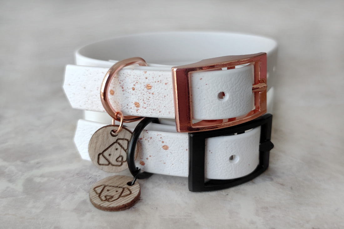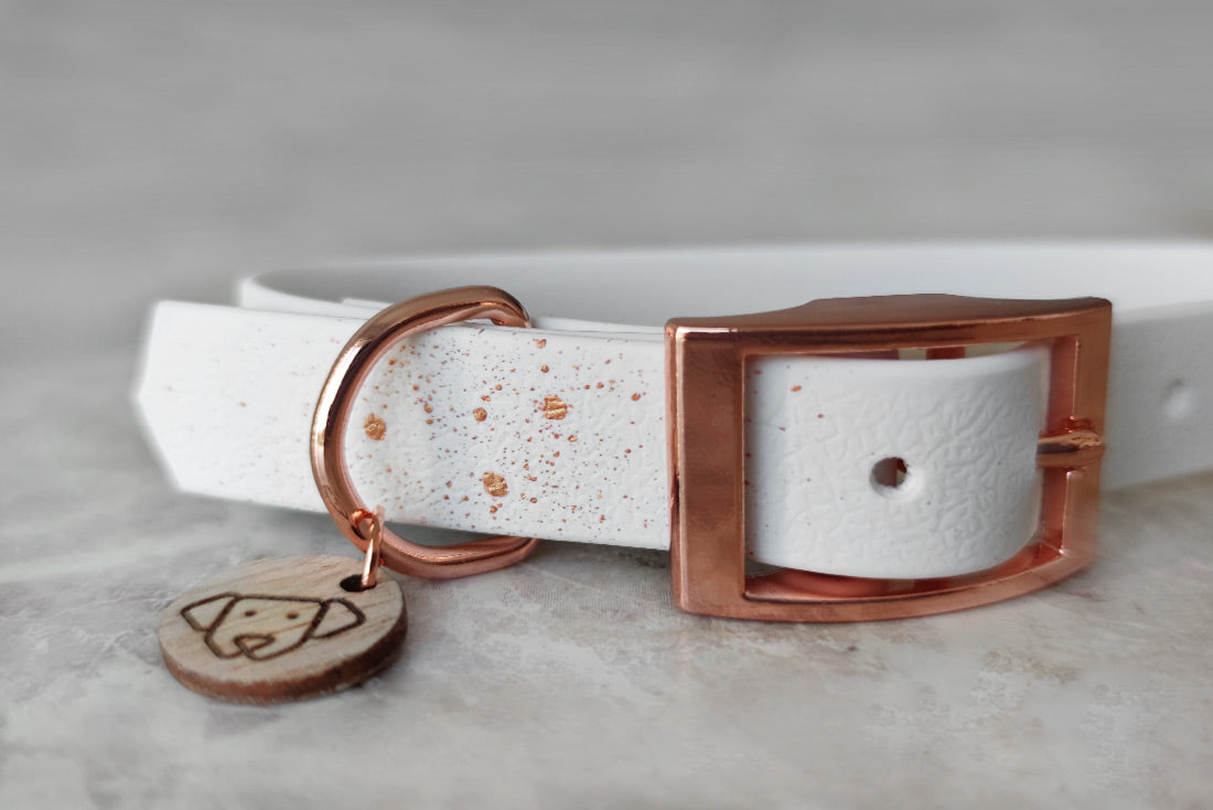 Coleira artesanal premium em pele vegan, com acabamentos de luxo. Resistente a todas as aventuras, mas muito suave ao toque.